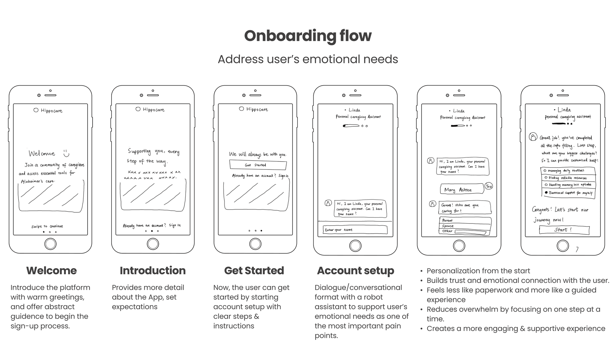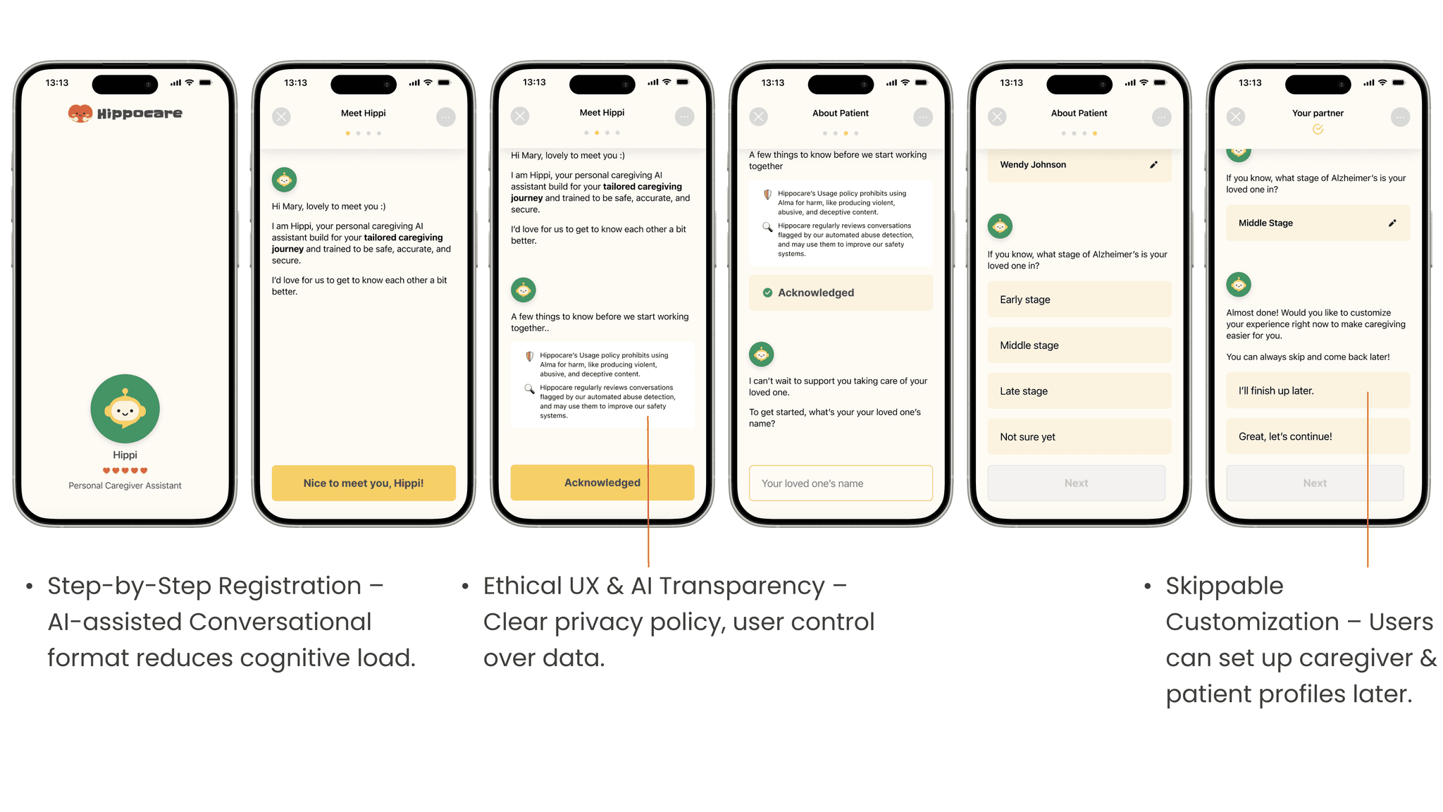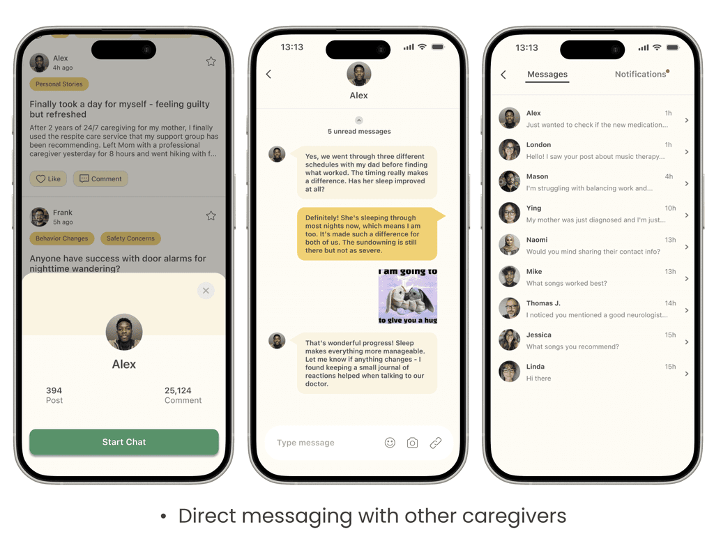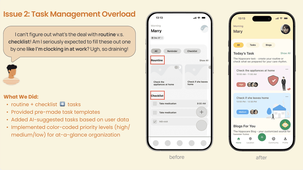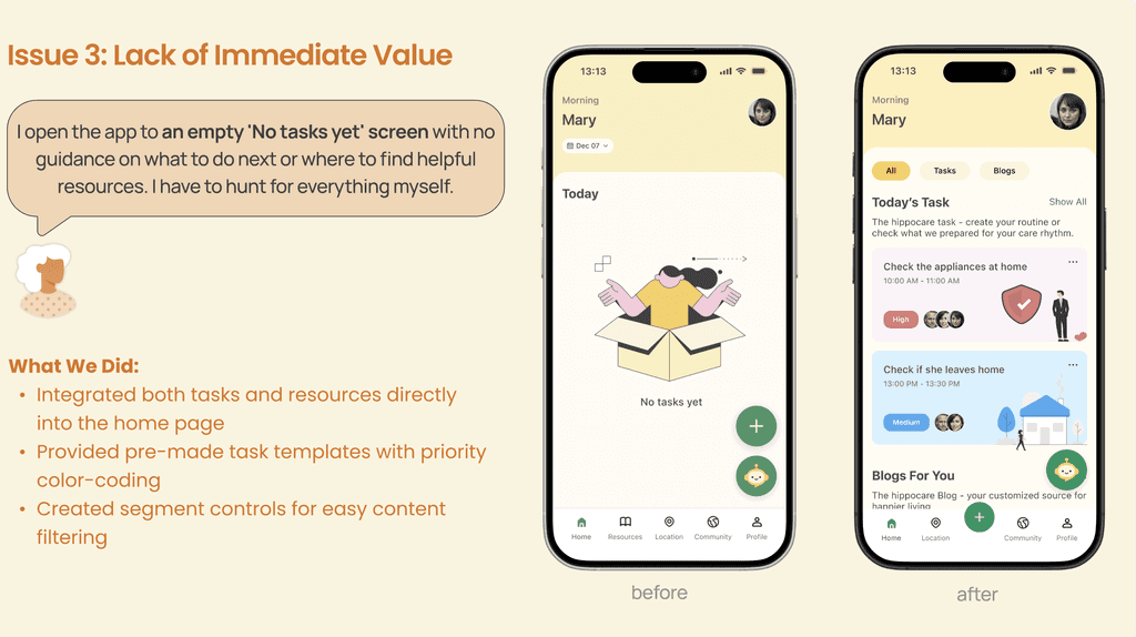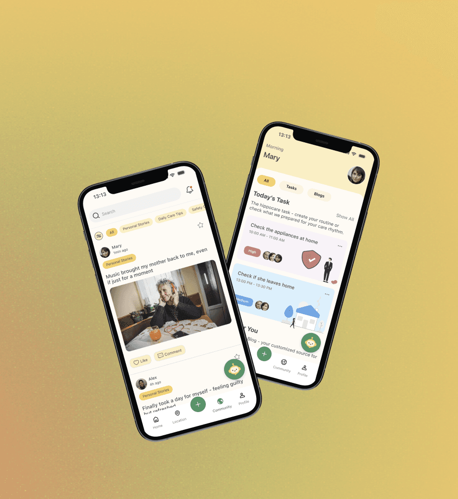 This revelation shifted our entire approach. HippoCare would become a companion for those providing care—a digital hand to hold through one of life's most challenging journeys.
