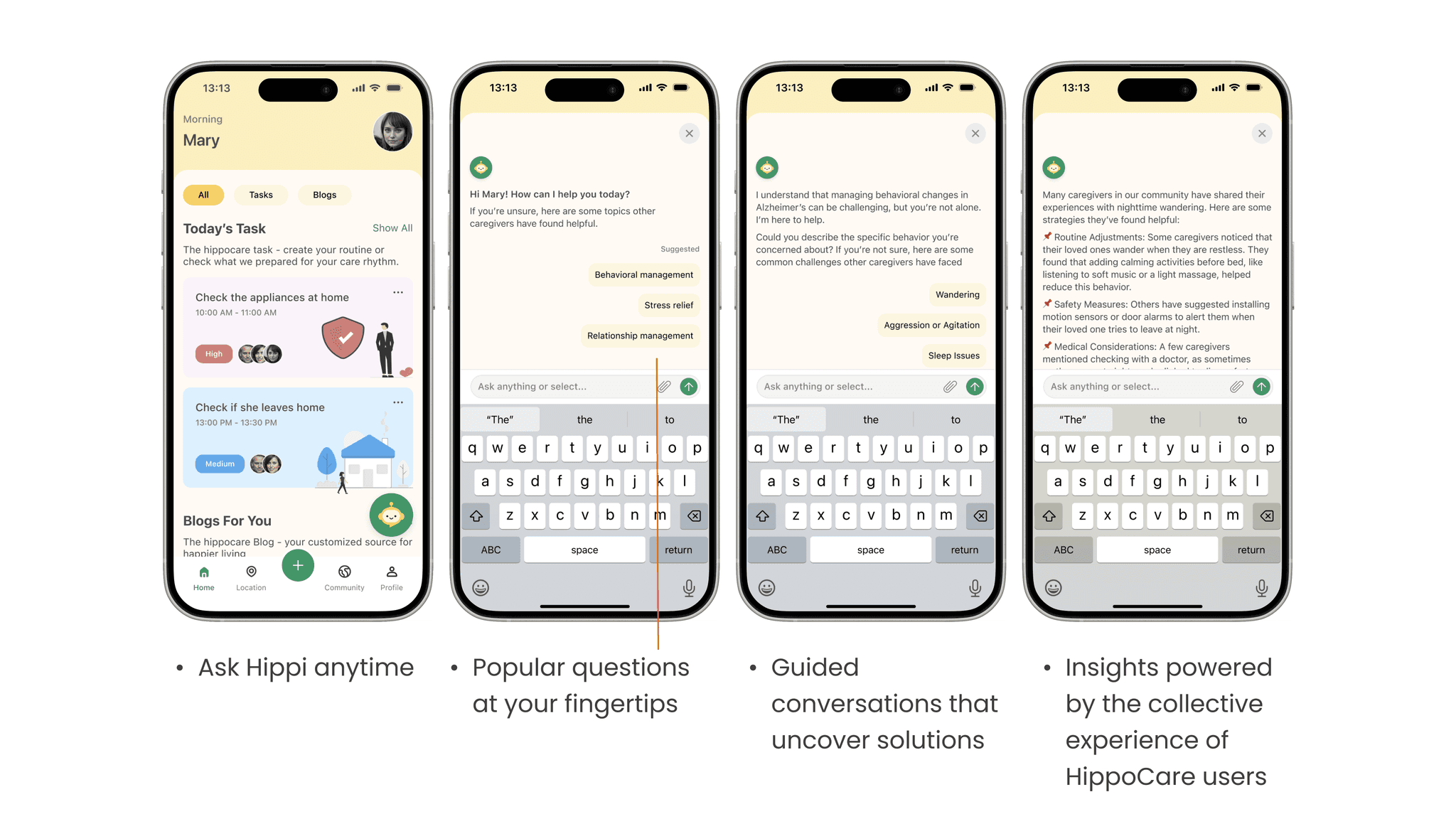 The floating Hippi icon provides instant support wherever caregivers are in the app. With a simple tap, users access a conversational assistant that offers pre-populated questions based on common challenges and personalized to their situation. What makes this AI truly valuable is its foundation in collective wisdom, synthesizing insights from thousands of real caregiver experiences shared within the community.