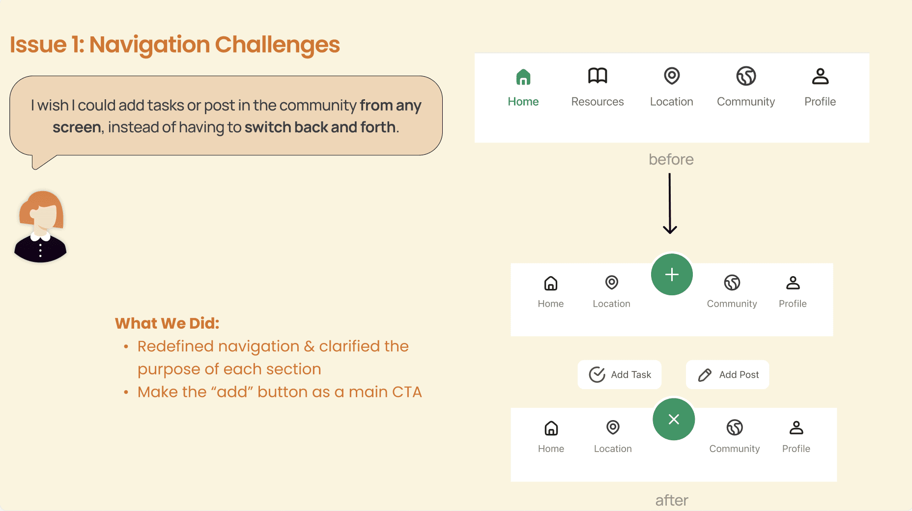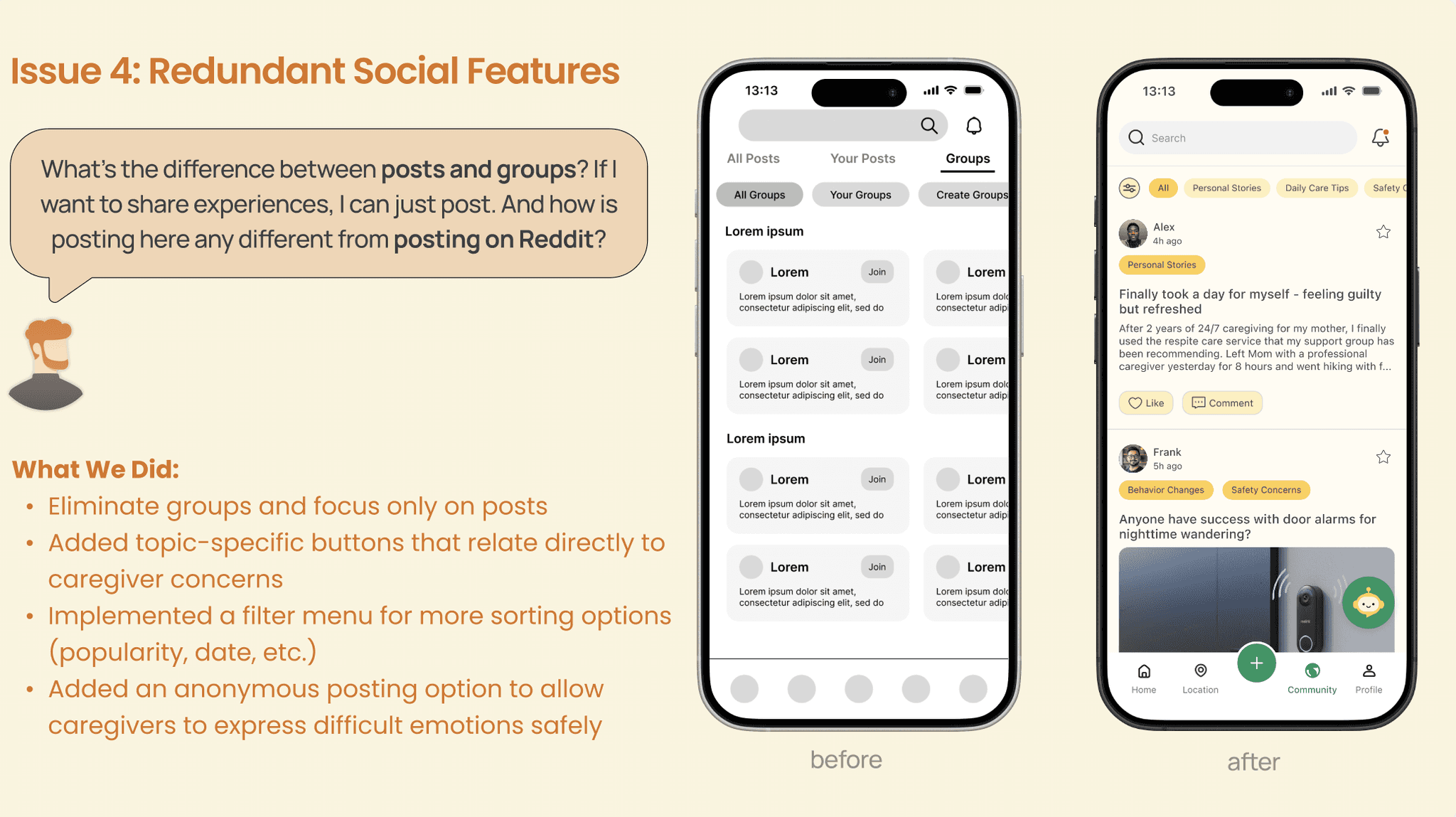 I learned that simplicity isn't just about fewer steps—it's about fewer decisions caregivers make when already overwhelmed. Through usability testing with Jason and Aishwarya from Amazon, we consistently refined by removing. We consolidated features, integrated resources into the home page, and streamlined navigation. Each subtraction recognized that for caregivers, cognitive load isn't just a UX principle—it's the difference between adoption and abandonment.