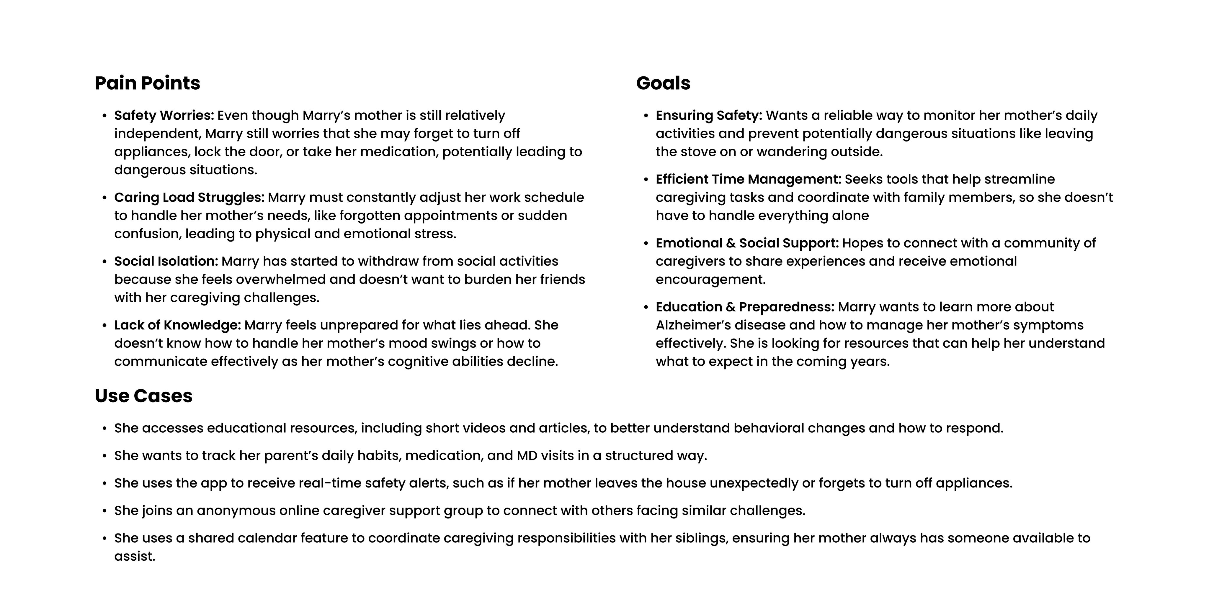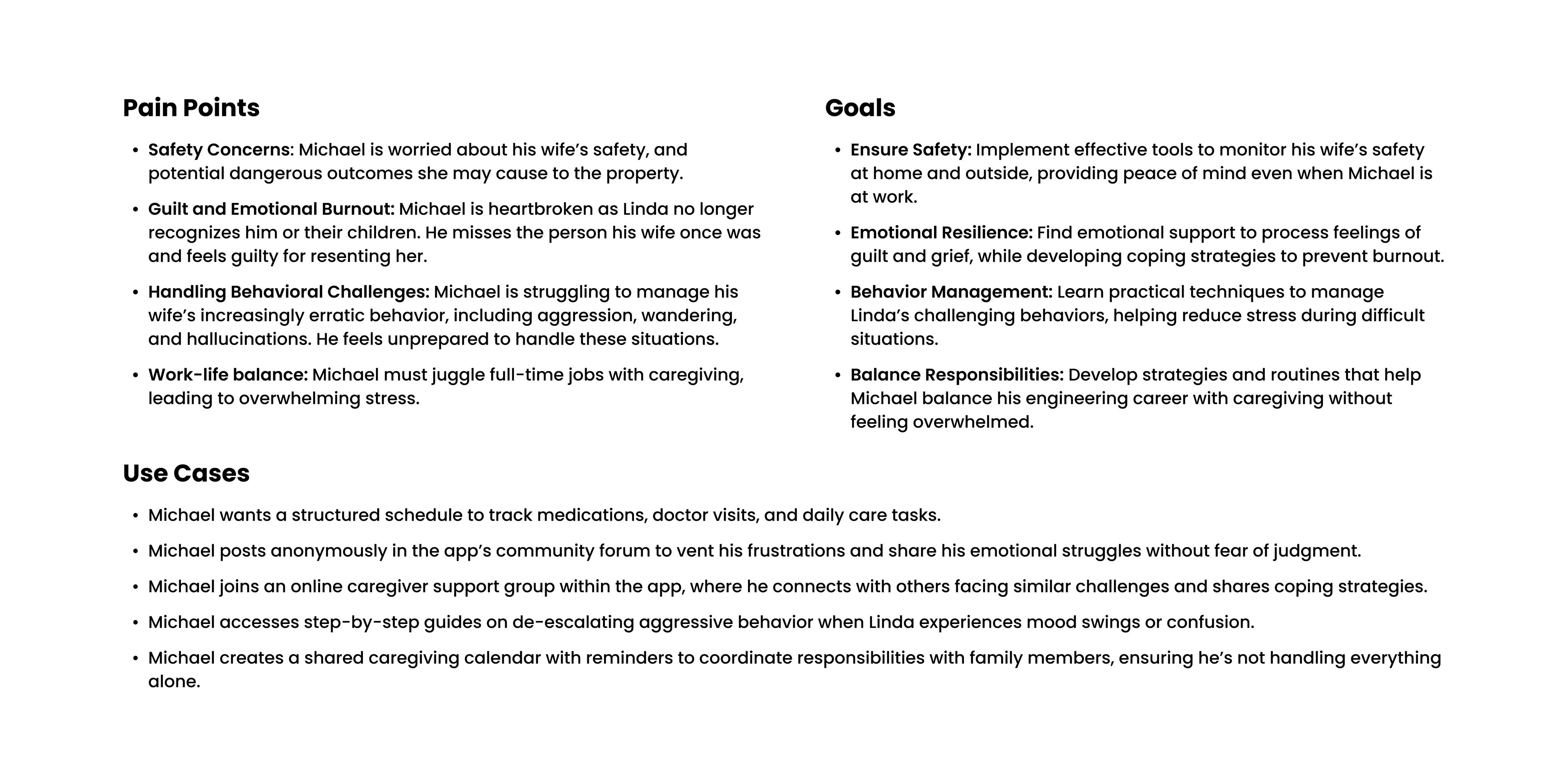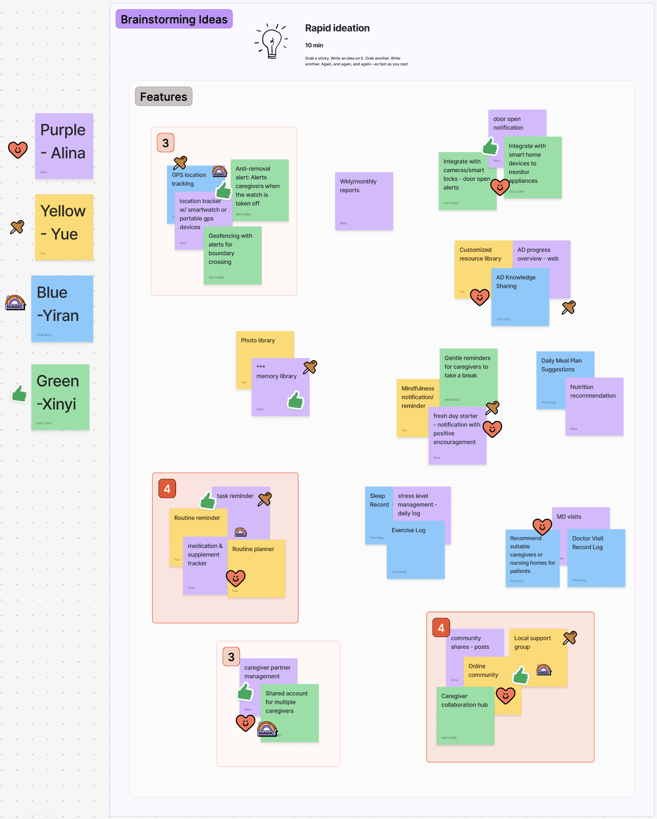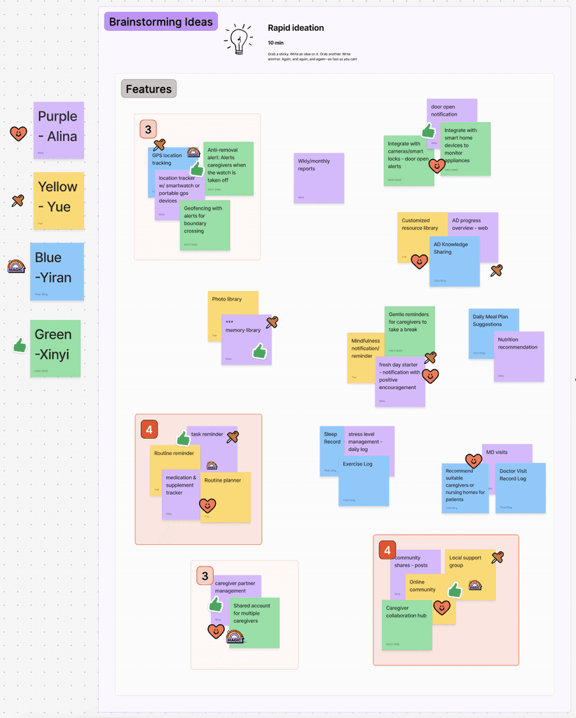 During our feature brainstorming and voting session, team members placed themselves in Mary and Michael's shoes—imagining what would truly make a difference in their caregiving journeys. Ideas flowed freely as we considered both practical needs and emotional support.