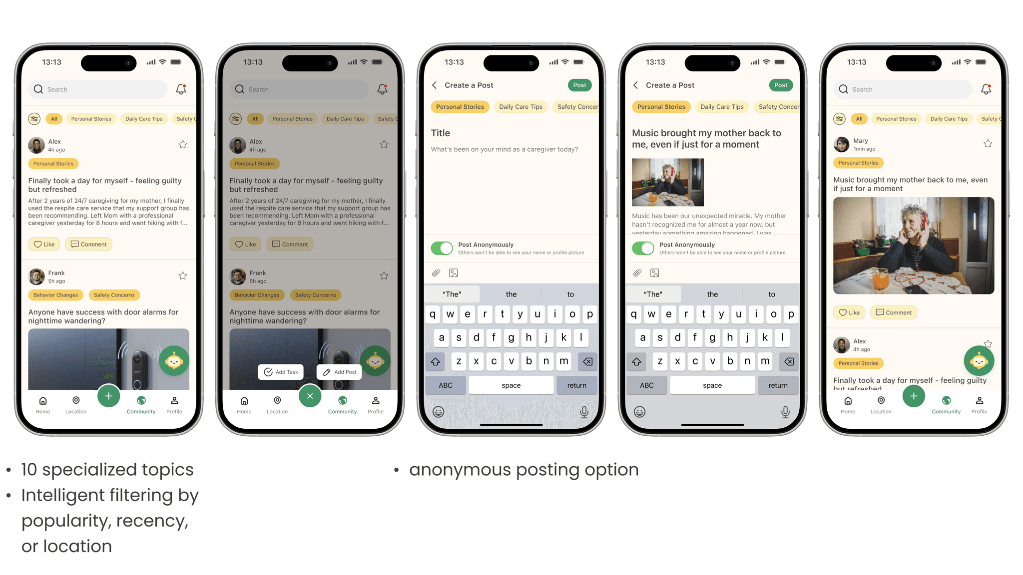 The Community screen creates meaningful connections between caregivers walking similar paths. Users can browse posts across 10 specialized topics tailored to caregiving challenges.